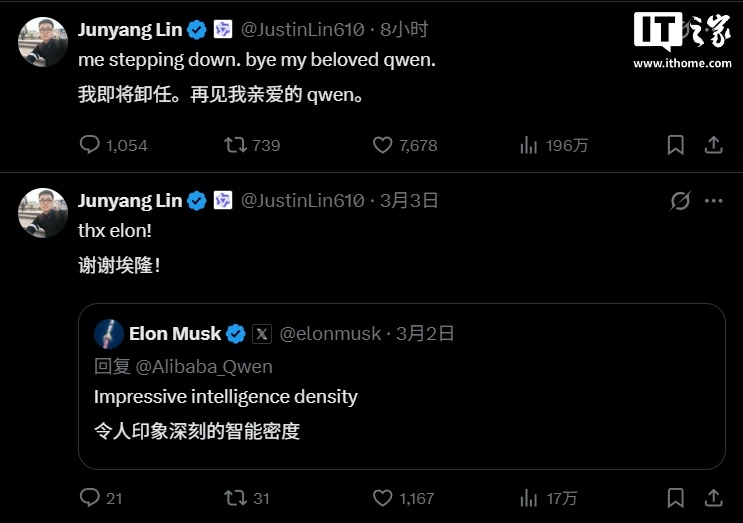 IT之家 3 月 4 日消息,阿里千问核心负责人林俊旸(yáng)3 月 4 日凌晨在 X 平台发文:me stepping down. bye my beloved qwen.(我卸任了。再见了,我亲爱的千问。)