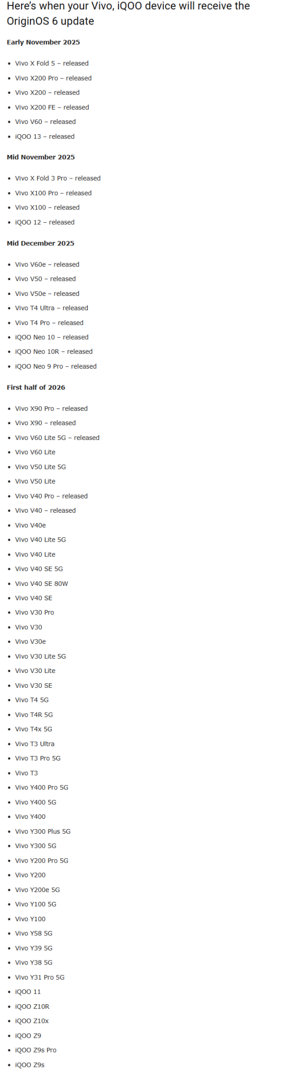 对于部分未在名单上的旧机型,官方表示将不再支持OriginOS 6更新。