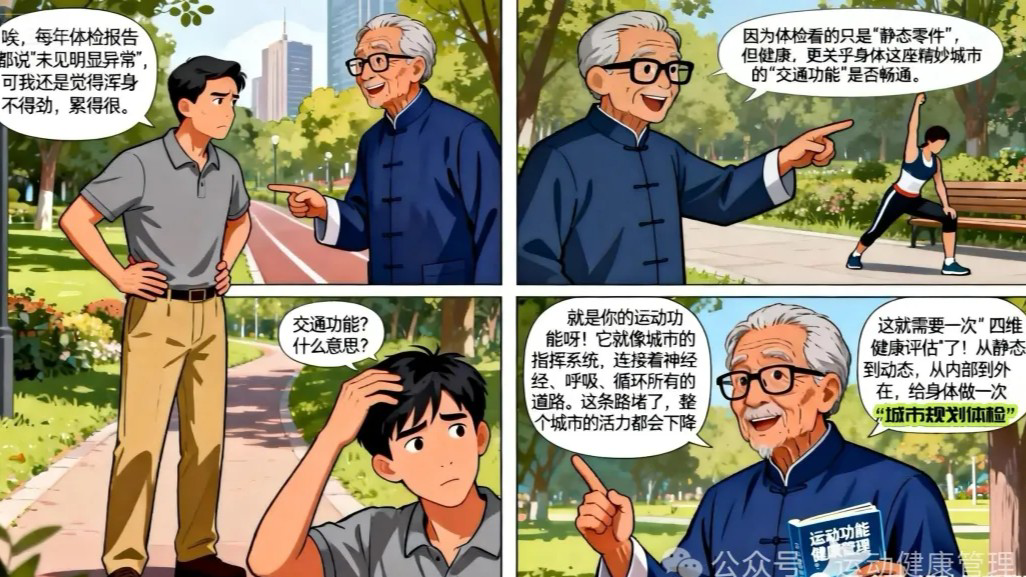 知己知彼、百战百胜。为此,“运动功能健康管理”方法首创“四维健康评估”体系。第一维是静态维度(健康体检):基础指标筛查(如血脂、血糖),识别器质性病变;第二维是动态维度(功能医学检查):检测代谢通路、肠道菌群、慢性炎症等,揭示能量工厂的运转效率;第三维是平衡维度(中医学评估):通过阴阳五行、气血虚实判断内在能量流动,指导药食同源调理;第四维是交互维度(运动功能评价):量化力量、柔韧、耐力等运动能力,破解“体检正常却浑身不适”的困局。